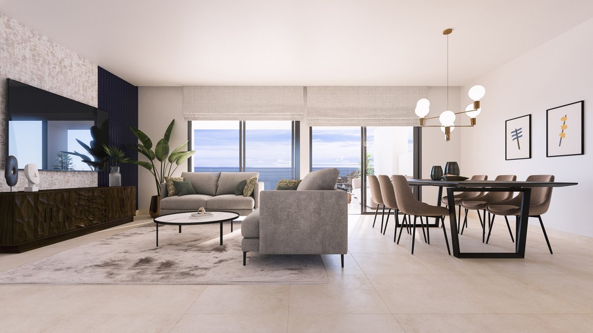 The complex is designed to resemble the sea, which can be seen directly from your terrace. The residential complex comprises three buildings, and their different heights allow for stunning sea and mountain views. One of the main advantages of these apartments is the feeling of spaciousness and light, thanks to their southwest orientation and large terraces and windows. Furthermore, all apartments have dual ventilation, both on the main façade and at the rear. The residential complex features: aerothermal air conditioning (cold/hot air), underfloor heating, motorized blinds on the balcony doors in the living room and master bedroom, a perimeter security system with CCTV cameras, and a Wi-Fi router in each apartment.
