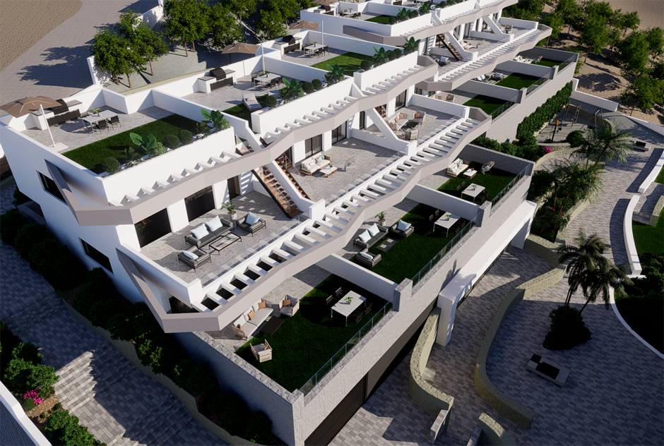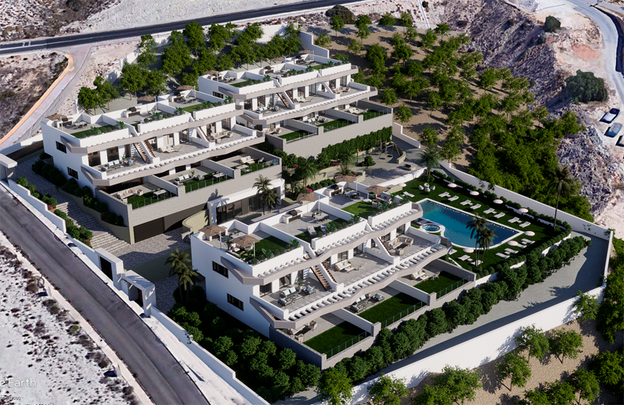 This bungalow complex features a communal pool and views of the sea and Benidorm. The ground floor boasts a terrace of over 100 m² with the potential for a private pool, while the upper floors offer two terraces of 41 and 90 m², respectively, and a solarium of over 90 m².
