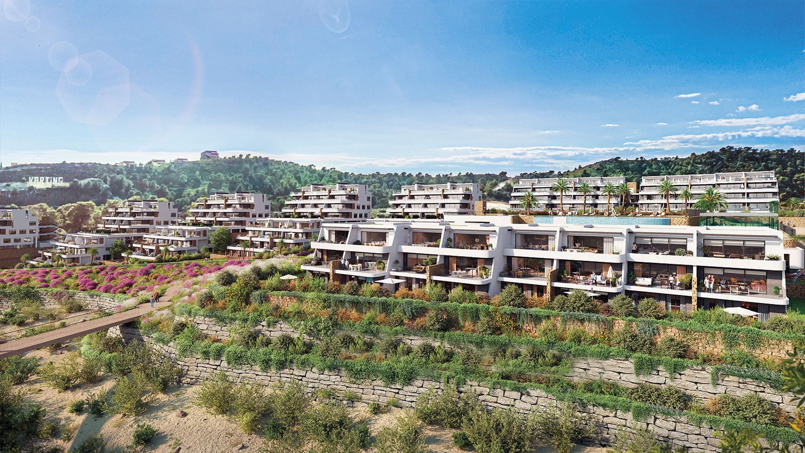 Las vistas al mar se extienden a través de amplios jardines a ambos lados del serpenteante cauce del río. Al otro lado del río se extiende un pequeño bosque mediterráneo y amplios senderos para andar en bicicleta, correr o simplemente pasear. En todo el complejo, muros de piedra forman terrazas ajardinadas con plantas trepadoras, arbustos mediterráneos, buganvillas y otras plantas.